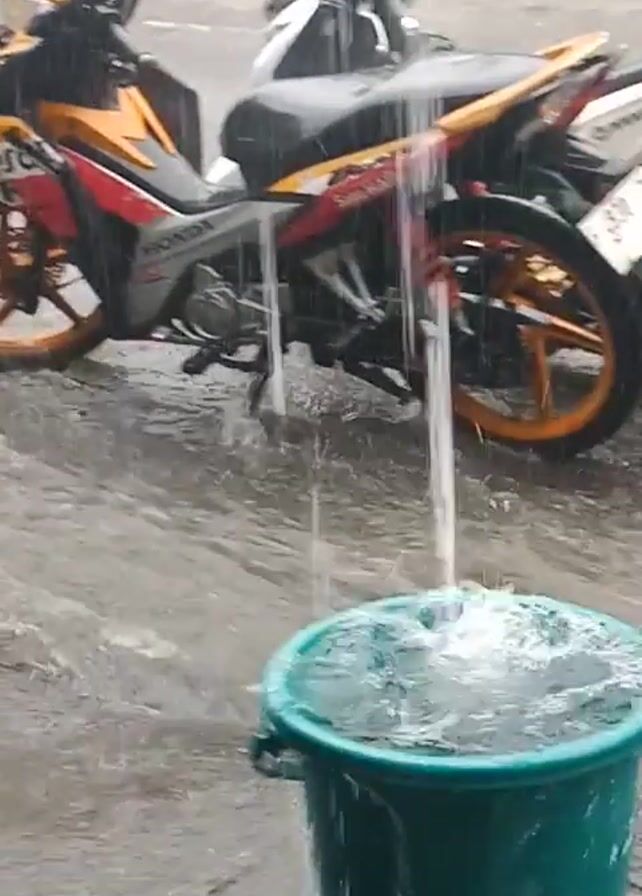 motorcycle and a yellow vehicle being washed. Water is being poured from a bucket onto the ground, creating a flow around the vehicles. The camera is angled upwards and moves slightly.