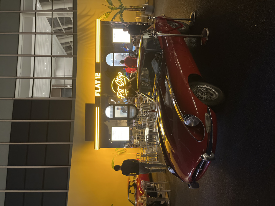 The image displays a nighttime scene outside Flat Twelve Cafe in Dubai Design District (d3), Dubai, United Arab Emirates. In the foreground, a dark red vintage Jaguar E-Type coupe is parked on asphalt, oriented towards the left. It features chrome trim and wire wheels, with two silver stanchions and red ropes positioned near its rear quarter panel. The mid-ground features the illuminated facade of the "FLAT 12" cafe, which has a bright yellow-orange lower wall. A black section above the main entrance displays a yellow neon "FLAT 12" sign and a white neon "Pit Stop" sign below it. Two service windows are visible, flanked by illuminated menu boards. An outdoor dining area in front of the cafe contains numerous light-colored metal tables and chairs. A red vintage convertible car is parked to the far left, partially obscured by a standing individual. Approximately 15 individuals are present. One person in a dark shirt and light trousers stands with their back to the viewer, near the convertible car on the left. Other individuals are seated at tables, standing near the cafe entrance, or visible within the cafe's service areas. Two potted palm-like plants are positioned on the right side of the cafe entrance. The background consists of a multi-story building with dark rectangular panels and large windows, some showing interior illumination. The scene is lit by artificial light sources, including neon signs and overhead lighting.