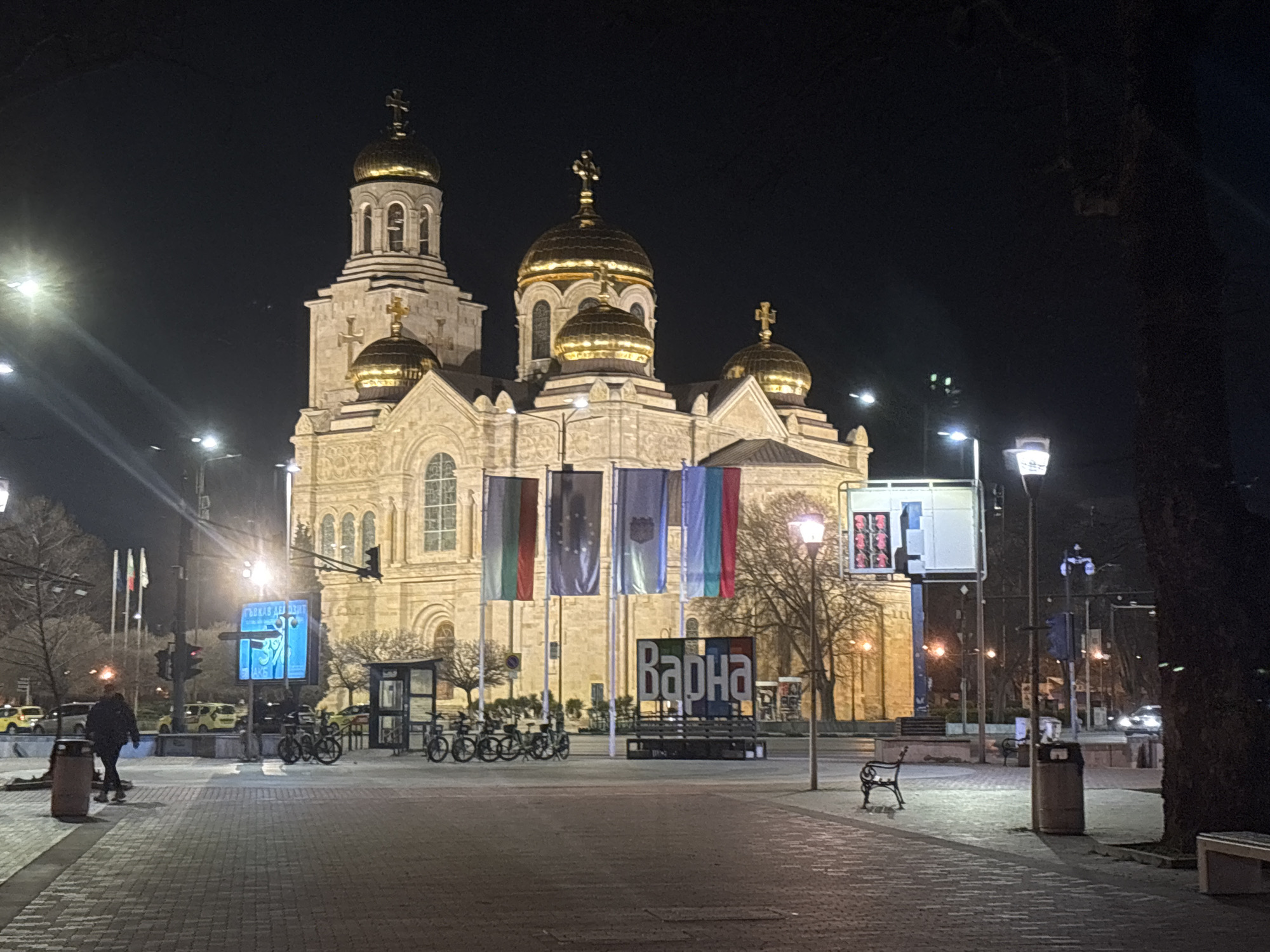 - "An exterior nighttime image depicts the illuminated Dormition of the Theotokos Cathedral in Varna, Bulgaria, centrally positioned against a dark sky" by FM-PgoFQ2, licensed under CC BY 4.0