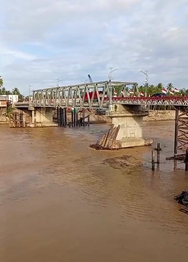view of a steel truss bridge spanning a wide, muddy river. The river appears to be high, possibly due to recent rain or flooding. The bridge is decorated with Indonesian flags along its sides. There are concrete supports in the river underneath the bridge, and some wooden planks. There's a crane on the bridge. The sky is overcast.