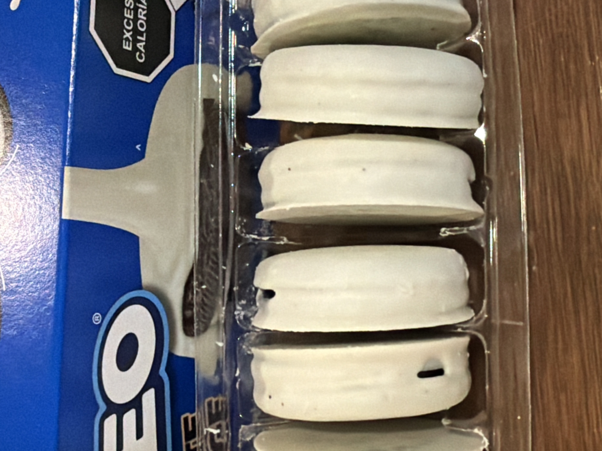 This image depicts a package of "Oreo" cookies, located in San Andrés Cholula, Mexico, resting on a brown wooden surface. The upper portion of the image shows a blue cardboard package with the white "OREO" logo, including a registered trademark symbol. To the right, a black octagonal warning label partially reads "EXCES CALORIA", indicating an excess calorie warning in Spanish. Below this, a visual illustration on the packaging shows a cookie partially submerged in a light-colored liquid, likely milk or cream. A clear plastic tray containing a row of six individually formed or coated items is visible in the foreground. These items are white, cylindrical, and have a smooth, confectionery coating. The items are vertically oriented within the plastic compartments. The first item from the left exhibits a small, black, elongated vertical mark. The second item from the left shows a small, dark, circular indentation near its top. The remaining items display minor surface irregularities. No people are present in the scene.