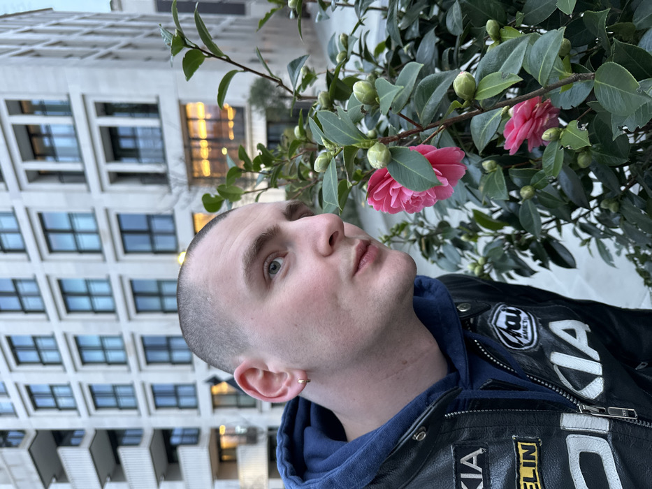 A man with a shaved head and an earring poses next to a camellia bush in full bloom. He is wearing a blue hoodie and a black leather jacket adorned with patches. Behind him, a tall building with a grid of windows rises into the sky. The image is taken from a low angle, tilting upwards to capture both the man and the architecture. The overall lighting is soft, and the composition focuses on the contrast between the natural elements of the flowers and the urban backdrop.