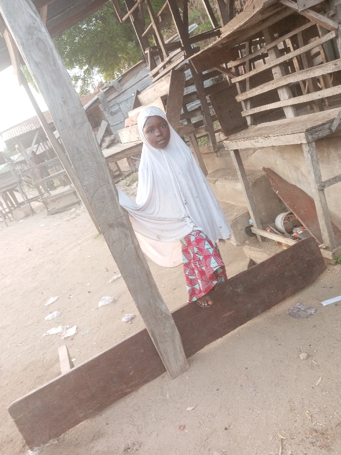 A young person wearing a white hijab and a patterned skirt stands near weathered wooden structures. One foot rests on a dark, elongated wooden plank. The scene is outdoors, with sandy ground and hints of foliage in the background. The wooden construction is exposed and seemingly unfinished, adding a rustic and somewhat derelict feel to the setting. The overall impression is one of a modest environment.
