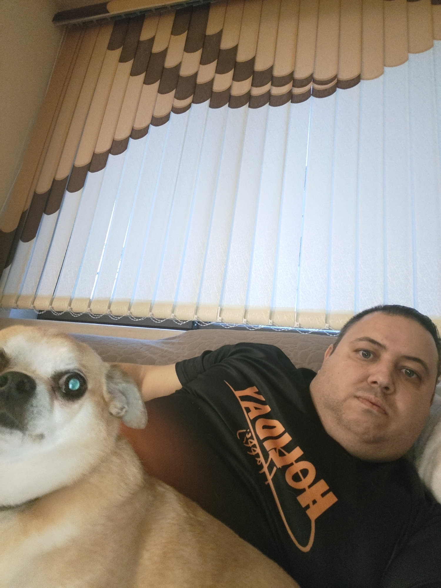 A close-up, angled shot shows a man and a dog lying down indoors. The man is fair-skinned with short dark hair, wearing a black t-shirt with "HONDA" printed in orange. He appears to be relaxed, looking directly at the camera. To his left is a tan-colored dog, whose left eye is distinctly highlighted, almost appearing to glow. The dog looks directly at the camera. Behind them is a set of vertical blinds, with a patterned valance at the top. The setting suggests a domestic interior. The location is Unknown, Unknown.
