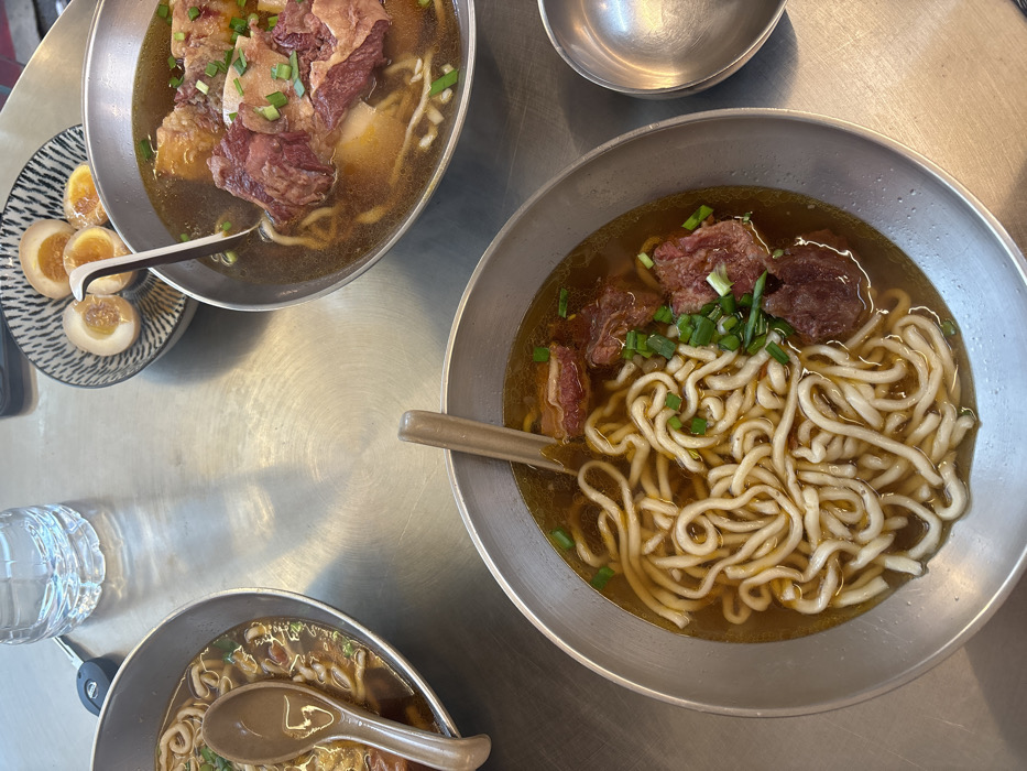 The image displays an overhead view of a meal set on a brushed metal table, located in a dining establishment in Yilan City, Taiwan. Three silver-colored metal bowls containing noodle soup dominate the scene. The two main bowls, situated in the bottom-center and upper-right, hold wide, flat noodles submerged in a dark brown broth, with visible chunks of stewed beef and a garnish of chopped green onions. The upper-right bowl also includes a piece of light-colored vegetable, possibly daikon. A beige plastic spoon is present in the bottom-center bowl and another in the partially visible bowl on the left. A silver metal spoon rests in the upper-right noodle bowl. To the far right, a small, empty silver metal bowl is positioned. A separate small ceramic plate, featuring a black and white striped pattern, holds four halved hard-boiled eggs or tea eggs, characterized by firm, pale orange yolks and darkened whites. In the upper-left quadrant, a clear plastic water bottle and a car key with a Nissan logo are visible on the table surface.