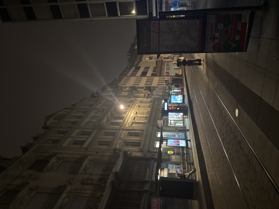 A night-time cityscape is captured in a slightly tilted shot. Tall buildings line the street, illuminated by streetlights and signage, with light shafts piercing the dark sky above. A bus stop sign stands prominently on the right. A person, possibly two, can be seen waiting. The cobblestone road adds texture to the urban scene. The overall impression is of a quiet, somewhat eerie night in the city.