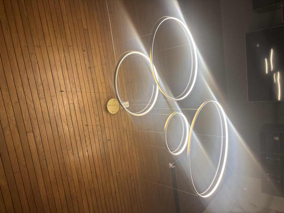 The image presents an interior view within Naucalpan de Juárez, Mexico. A contemporary chandelier, comprising four illuminated circular rings of varying diameters, is suspended from a ceiling composed of light-brown wooden planks arranged horizontally. Each ring emits a bright white light, producing noticeable light flares and reflections. The chandelier is affixed to the ceiling via a central, circular, gold-toned mounting plate and supported by thin suspension wires. Below the chandelier, a dark-colored display screen, reflecting the light as multiple horizontal streaks, is centrally positioned. Portions of dark shelving units are partially visible on either side of the screen, set against a dark background wall. No individuals or specific actions are depicted.