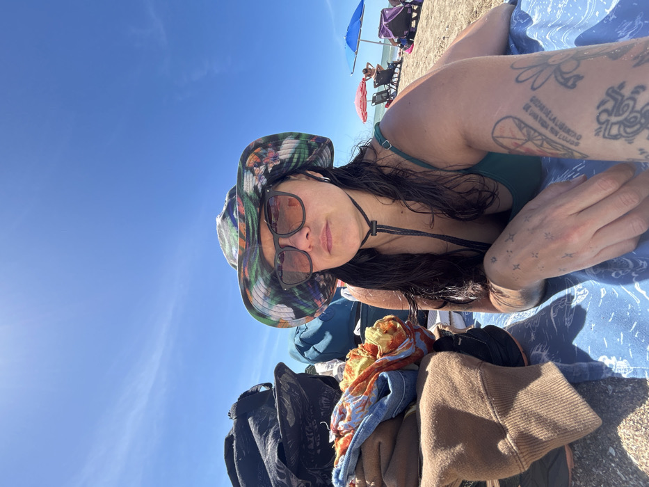 A woman poses on a beach in a selfie. She wears a colorful hat and sunglasses. Her dark hair falls around her shoulders. Tattoos adorn her arm. The background shows a blue sky, beachgoers, and a blue beach towel. Clothes and bags are piled in the foreground. Umbrellas and chairs can be seen in the distance.