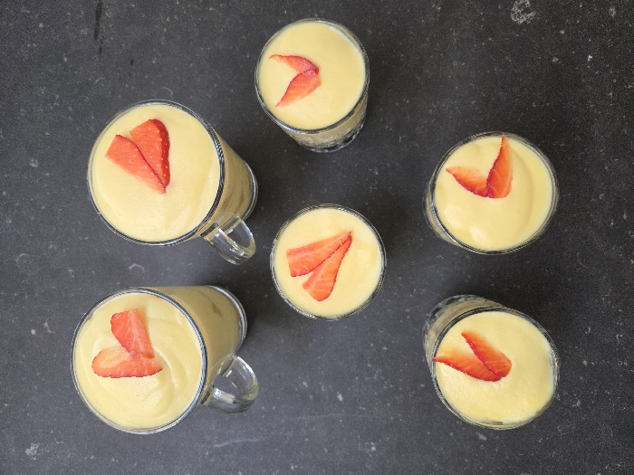 Six clear glass vessels containing a light yellow, opaque substance, each garnished with two red strawberry slices, are arranged on a dark, mottled surface in Eeklo, Belgium