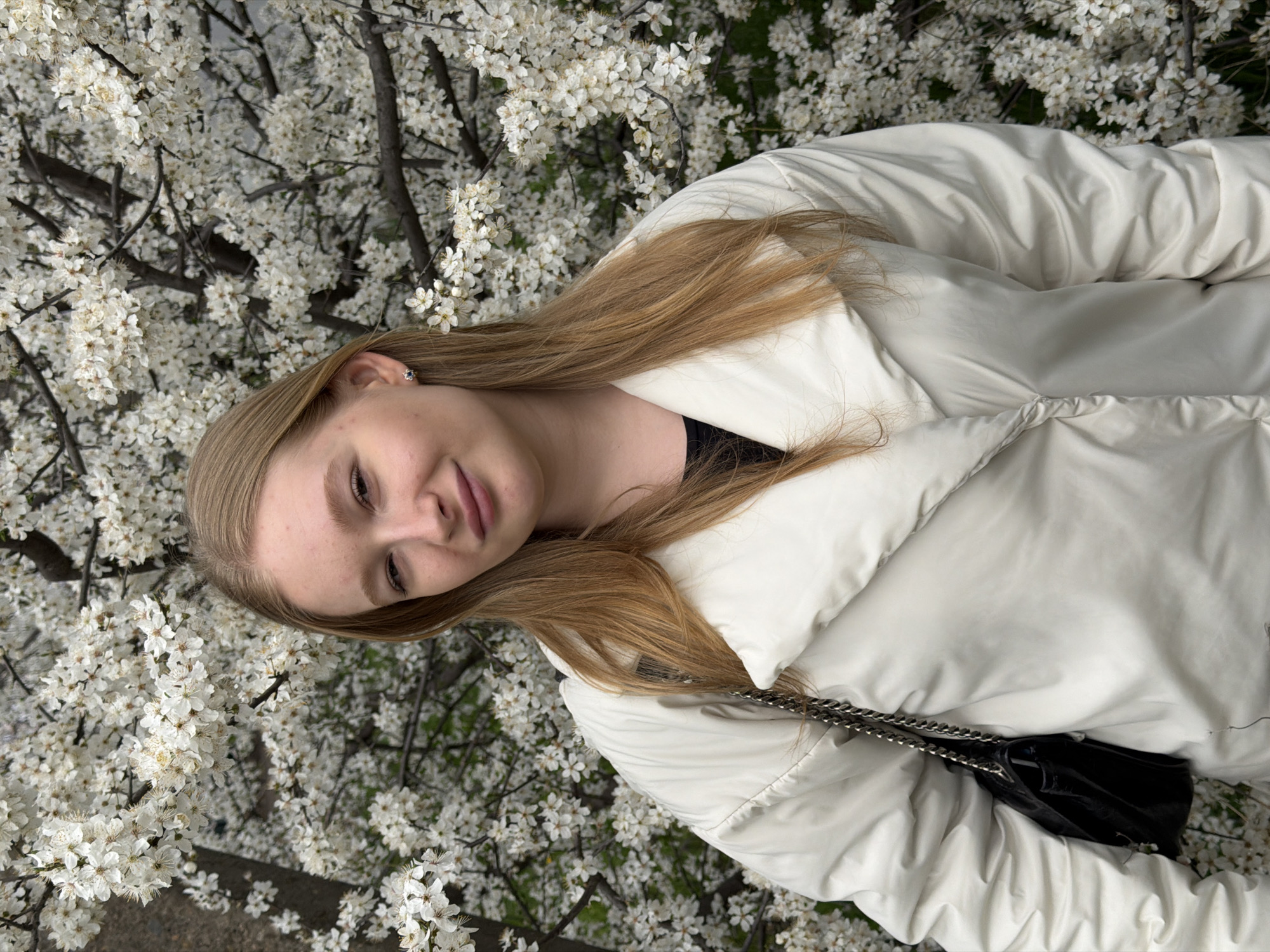 A young woman poses outdoors in Yuzhny, Russia. She is surrounded by a flowering tree with white blossoms. The woman wears a light-colored puffy jacket, and a dark purse hangs from her shoulder. She has blonde hair and is wearing an earring. The background consists primarily of the tree's white flowers.