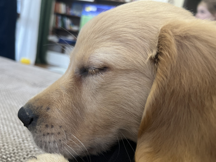 A light golden-colored canine puppy, possibly a Labrador Retriever or Golden Retriever, is shown in a close-up profile view, facing left. The puppy's eyes are closed, indicating it is resting or asleep. Its head, including the snout, closed eyelids, and a floppy ear, occupies the majority of the frame. The fur is short and light golden-brown. Visible features include a dark, moist nose and multiple small, dark spots on its muzzle corresponding to whisker follicles, from which light-colored whiskers extend. The puppy's head appears to be resting on a dark, indistinct surface, possibly clothing or a cushion. In the immediate foreground, beneath the puppy's snout, is a light beige, textured fabric, likely upholstery. The background is significantly out of focus, revealing an indoor setting. To the upper left, a dark bookcase filled with books is discernible, along with indistinct colored objects, including a blue-green item and a yellow item on a shelf. In the upper right corner, a blurred outline consistent with a human head or shoulder is faintly visible, suggesting the presence of an individual in proximity to the puppy. The scene is located in Kostinbrod, Bulgaria.