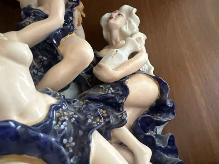 A ceramic figurine features three nude female figures draped in flowing, dark blue fabric adorned with small, light-colored floral patterns