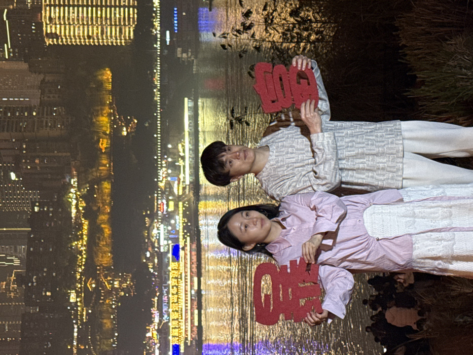 The image depicts two individuals, one female and one male, standing side-by-side at night, holding red paper-cut Chinese characters. The scene is located in 江北城街道 (Jiangbeicheng Subdistrict), Chongqing, China, with a brightly illuminated cityscape across a wide river forming the background. The female, positioned on the left, has dark shoulder-length hair and wears a light pink and white striped collared shirt with a cinched waist over a long, white, textured or lace skirt. She holds a red cutout character resembling "恭" (gōng) in both hands. The male, on the right, has short dark hair and wears a long-sleeved, light-colored shirt with a repeating geometric pattern, paired with light-colored trousers. He holds a red cutout character resembling "喜" (xǐ) in both hands. Both individuals face slightly forward, with neutral expressions. Behind the individuals, a wide body of water, likely the Jialing or Yangtze River, reflects the numerous lights from the distant city. Several large, brightly lit passenger boats or cruise ships are visible on the river. The far bank is dominated by a densely packed skyline of high-rise buildings and various structures, all extensively illuminated, characteristic of a major urban center at night. A multi-level waterfront area with additional lighting is discernible between the river and the main high-rise buildings. Dark vegetation is present in the immediate foreground to the right of the male subject.