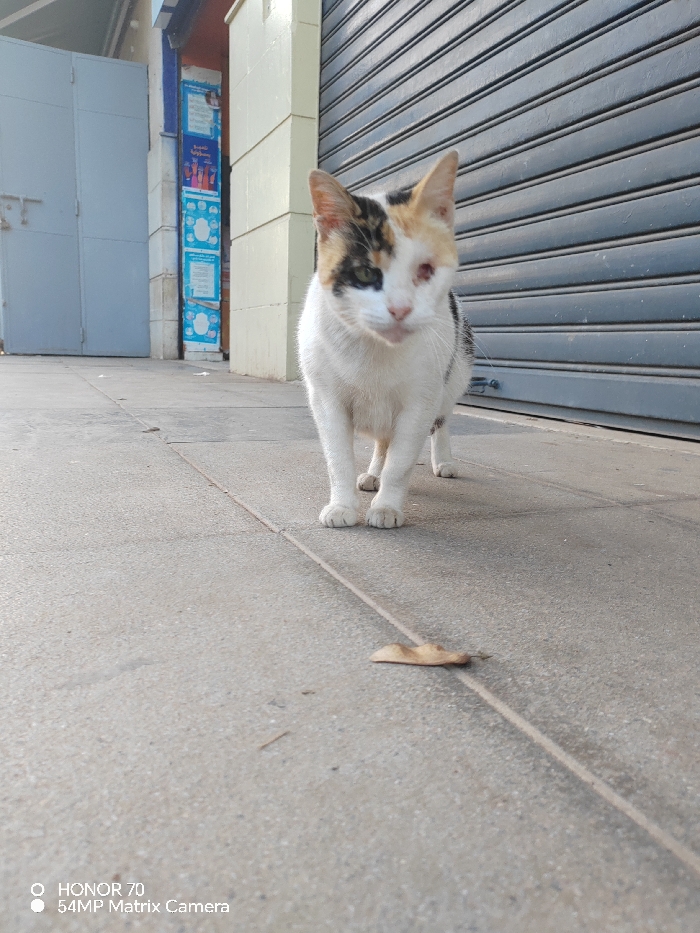 A one-eyed cat stands on a sidewalk, its white fur marked with patches of black and tan. The background includes a closed, horizontally-ridged metal door and a building facade with a gray door on the left and a pillar beside it with posters. A small, brown leaf lies on the pavement in front of the cat. The image is a clear, well-lit shot capturing the animal's direct gaze toward the camera. The focus is primarily on the cat, with the background elements slightly blurred.