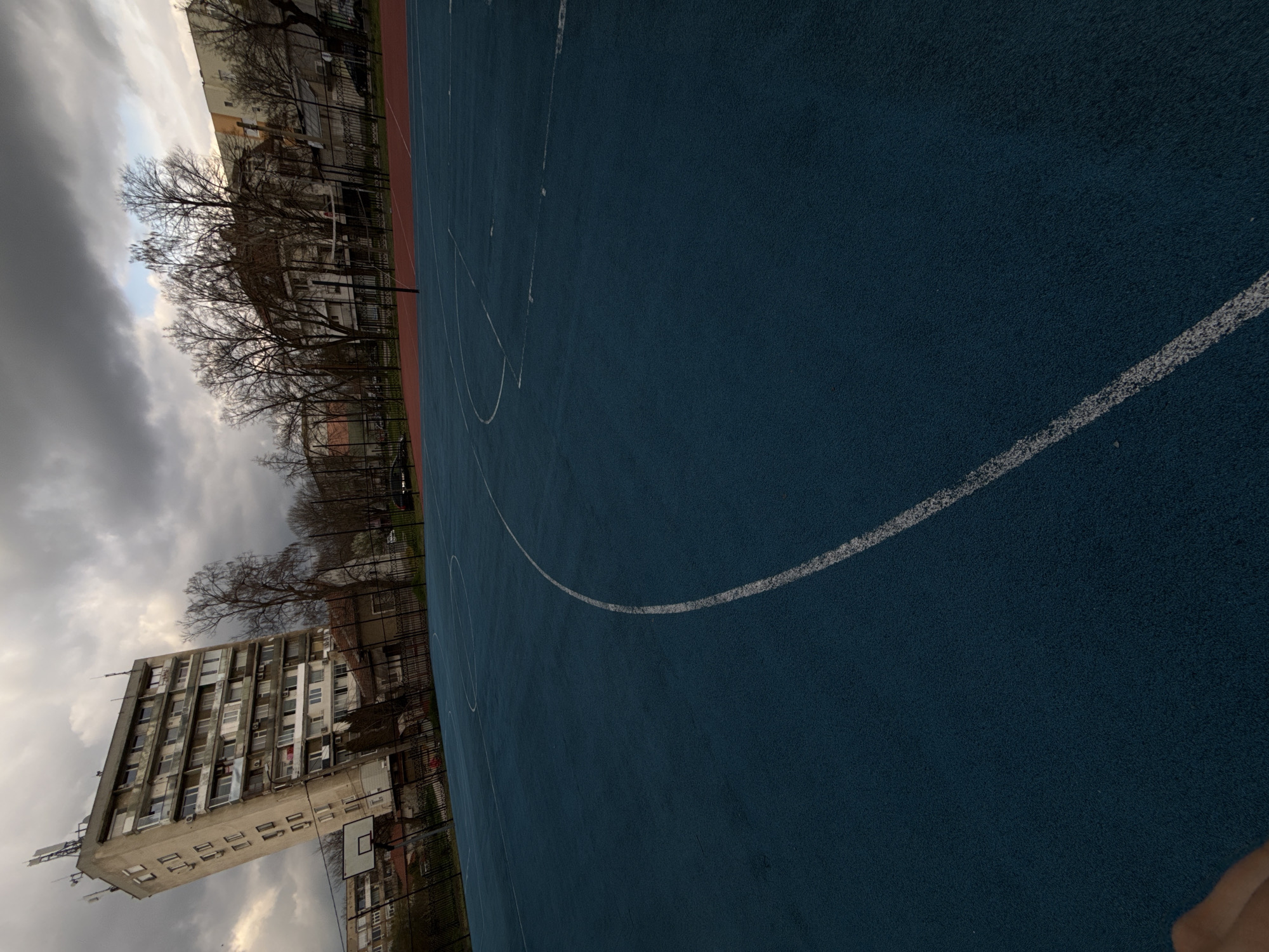 A tilted low-angle shot shows a blue outdoor basketball court with white lines in Vidin, Bulgaria
