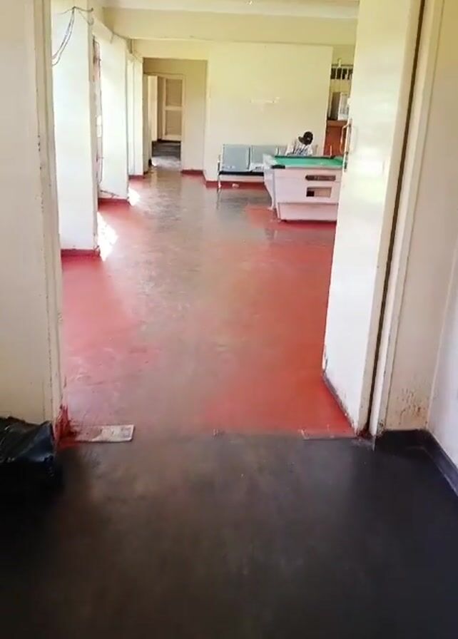 interior of a room with multiple pool tables. The floor nearest the camera is black, transitioning to a red color in the main area of the room. The walls are white, and there are multiple doors and windows. In the distance, a person is visible near one of the pool tables. One pool table is white, and another is green with "Heineken" branding. A brick bar is located near the windows. The camera moves forward into the room.
