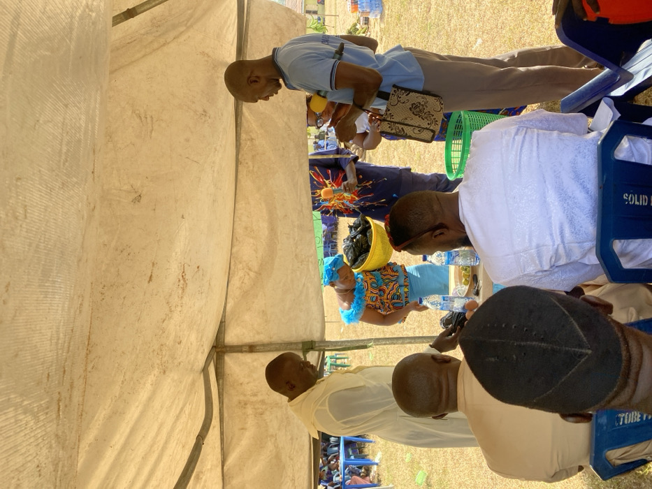 The image depicts an outdoor gathering under a large, light-colored canvas canopy in Itobe, Nigeria