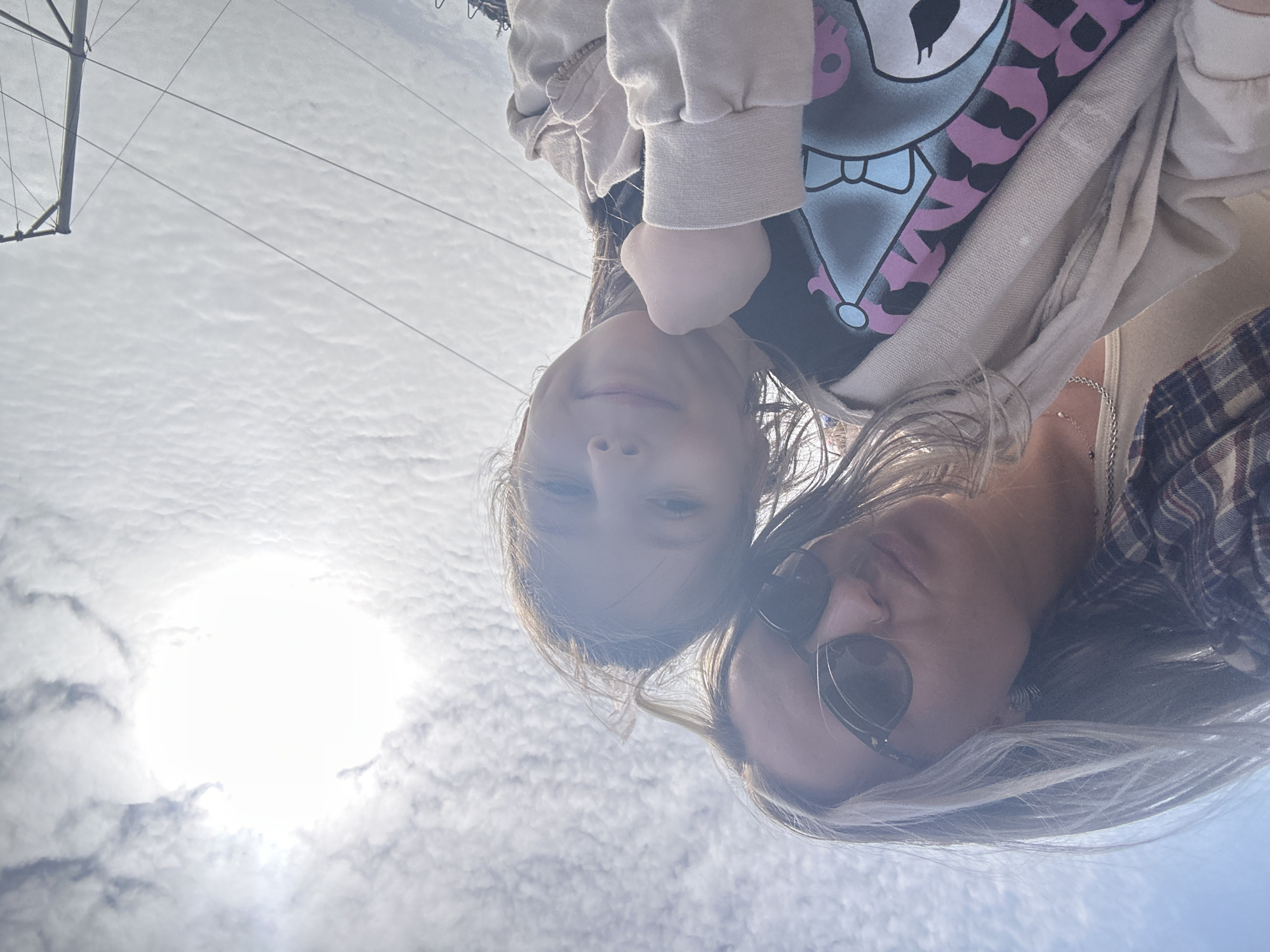 Two people, a child and an adult, are oriented upside down in the frame, with the sky visible in the background. The sky is cloudy with a bright light source, possibly the sun, obscured by the clouds. The child has fair skin and appears to be smiling. The adult is wearing sunglasses and has light-colored hair. The adult wears a plaid shirt and a necklace. The child wears a jacket and a black t-shirt. A metal tower structure is visible in the top left corner. The location is Başakşehir, Turkey.