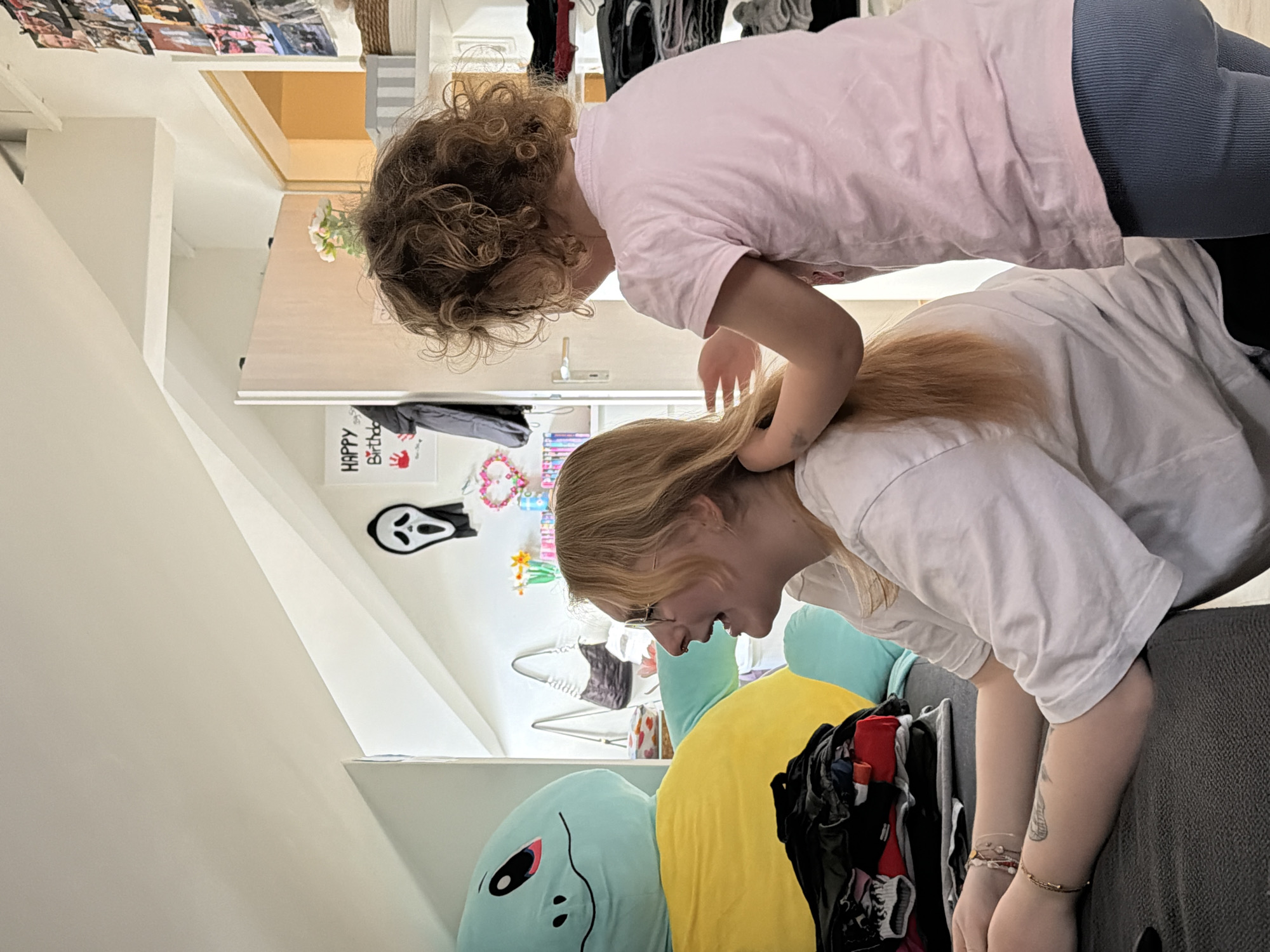 The scene depicts an indoor setting within a residence in Trassem, Germany, characterized by white walls and a sloped ceiling, indicative of an attic or upper floor room. An adult female with blonde hair, wearing glasses, a white t-shirt, and multiple bracelets and forearm tattoos, is seated on the left. She is looking to her left with an open-mouthed expression, suggesting laughter or conversation. Behind her stands a young child with curly brown hair, dressed in a pink t-shirt and blue ribbed leggings. The child is actively engaged in styling or playing with the adult's hair, holding a section of it with both hands. To the left of the adult, a large light blue and yellow plush toy, resembling a Squirtle character, is prominent. In front of this plush toy, a dark surface holds a stack of folded clothing. The background features various personal items and decorations: a "HAPPY Birthday" sign with red handprints and a black Ghostface mask are affixed to a white wall. A light-colored wooden door and a shelving unit are visible. The shelving unit contains stacked clothes, baskets, and framed photographs. A white handbag hangs on a wall to the left of the shelving unit. A small vase with white and yellow artificial flowers is also present on a surface in the background.