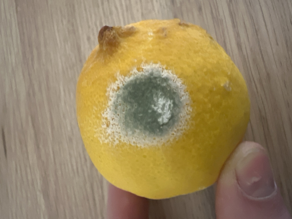 A single yellow lemon is held in a human hand, presented in a close-up view against a blurred wooden surface. The lemon displays a circular patch of blue-green mold, bordered by a fuzzy white growth, covering a significant portion of its visible surface. A bare thumb and forefinger are visible on the left, gripping the lemon. The background appears to be a light-toned wooden tabletop or counter, suggesting an indoor environment. The image contains no visual information to identify the location as Cherbourg-en-Cotentin, France.