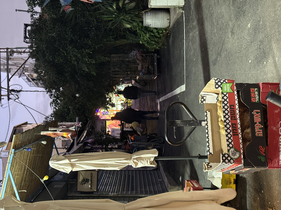 The image depicts an urban alleyway, likely a market street, at dusk or early evening in Tel Aviv, Israel