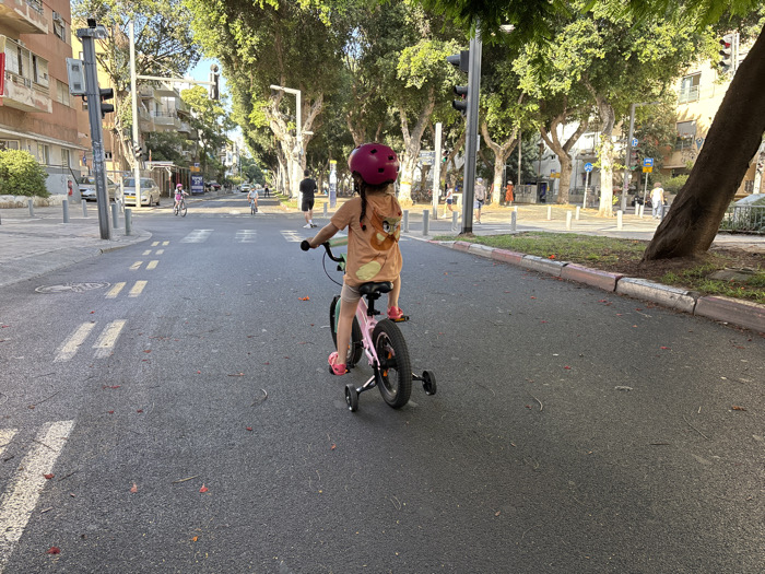 A child wearing a pink helmet, orange shirt, and light shorts rides a pink bicycle with training wheels down the center of an asphalt street. The child is viewed from behind, with hands on the handlebars and feet on the pedals. The street, which appears to be a tree-lined thoroughfare in a residential area of Tel Aviv, Israel, extends into the background. To the left, a multi-story residential building with balconies and a parked white car line the street, alongside a sidewalk and a traffic light pole. White dashed lines, indicative of a pedestrian crossing, are marked on the asphalt further down the road. Two other children on bicycles are visible in the mid-ground, one on the left side of the street and another further ahead on the right. To the right, a paved area with bollards separates the roadway from a grassy median and a prominent line of tall, leafy trees. Several adult pedestrians are visible walking on the sidewalks and paths in the background. The scene is illuminated by natural sunlight, indicating clear weather conditions. Scattered red petals or leaves are visible on the dark asphalt surface.