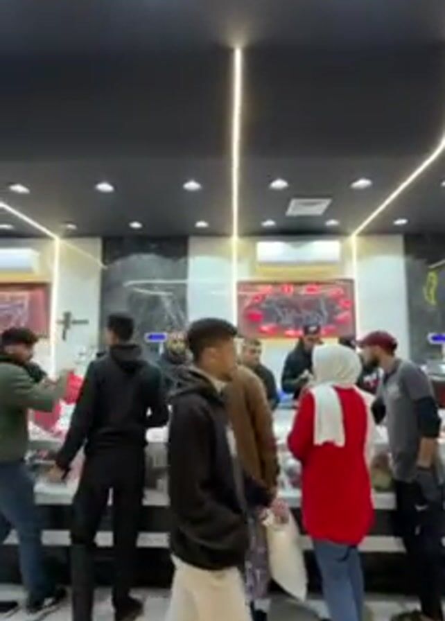 busy butcher shop. Several customers stand in line at the counter, which is stocked with meat. Behind the counter, four butchers are working, preparing and serving the meat. The shop has a modern design with black ceilings, marble-patterned walls, and bright lighting. There are neon lights above the counter, and decorative images of meat cuts on the walls.