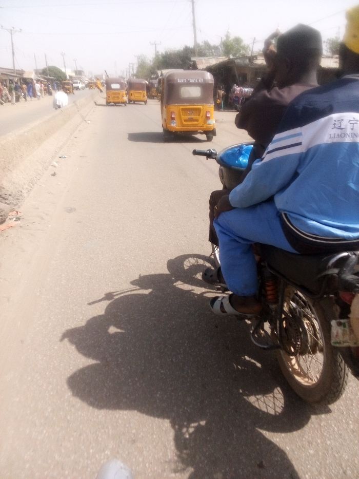 The scene depicts a daytime street in Dakata, Nigeria. The perspective is from the rear of a motorcycle, looking forward. In the immediate foreground, the back of a dark motorcycle is visible on the right, with a passenger wearing a blue long-sleeved top with white and dark blue stripes, and matching blue pants. A white sandal is visible on the passenger's right foot. Another individual, the driver, is seated in front, partially obscured. A large, distinct shadow of the motorcycle and its occupants is cast on the road surface to the lower left. The road ahead is paved, light-colored, and appears dusty. A concrete median separates the visible lane from the left side of the road. Multiple yellow and brown three-wheeled auto-rickshaws are proceeding in the same direction, further down the road. The nearest auto-rickshaw displays "DAKATA TRI-CYCLE ASSN" on its rear. To the left of the road, there is a dirt shoulder with several pedestrians and indistinct buildings in the distance. Utility poles with overhead wires are visible along both sides of the road. To the right, a series of simple roadside stalls with corrugated metal or tarp roofs line the street, with additional pedestrians nearby. The sky above is bright and hazy.