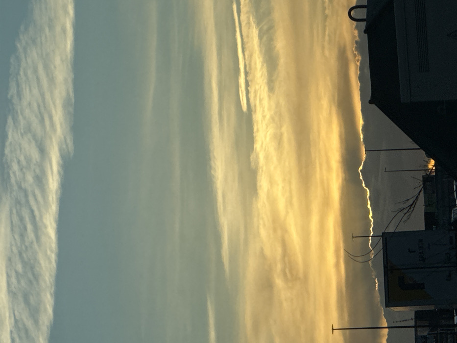 An image of a sunrise sky. The left of the frame shows a sky with clouds, while the right half of the frame is more golden with sunlight hitting the clouds. Part of a building is shown, and some other human-made items, such as light poles. The sky is the primary focus.