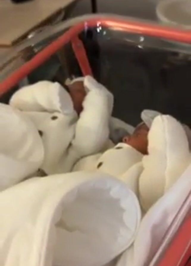 two infants lying in a side-by-side bassinet. They are swaddled in white blankets and have white knitted caps on their heads. The bassinet has a clear plastic cover supported by a coral-colored frame. The room is bright and appears to be inside of a house, with a table and sink visible in the background. The camera is fairly close to the bassinet and focuses on the two babies.