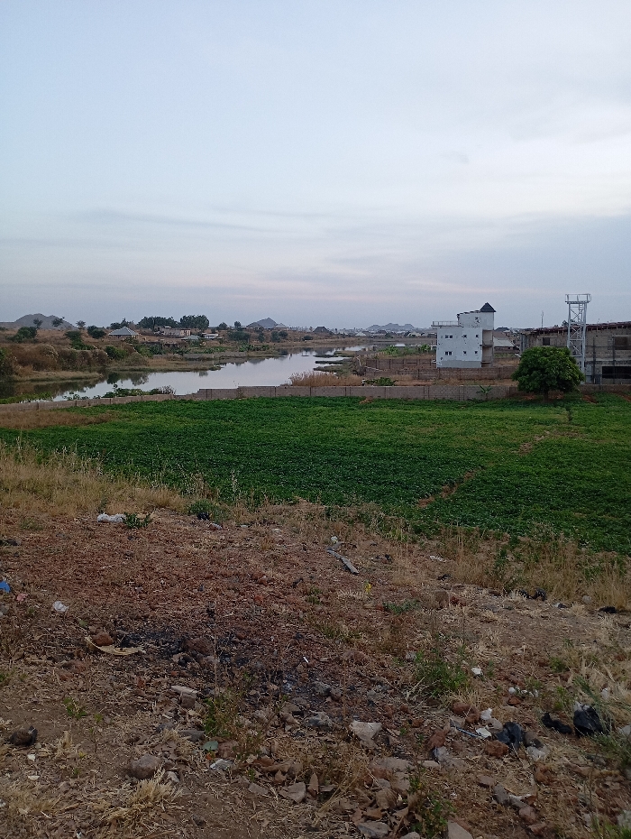 A landscape view shows a body of water with a building and construction in the background. Lush green farmland sits in the middle ground, while the foreground features a barren, rocky terrain. Hilly terrain is visible in the far distance under a pastel-colored sky. The scene is framed by a muted, natural color palette.