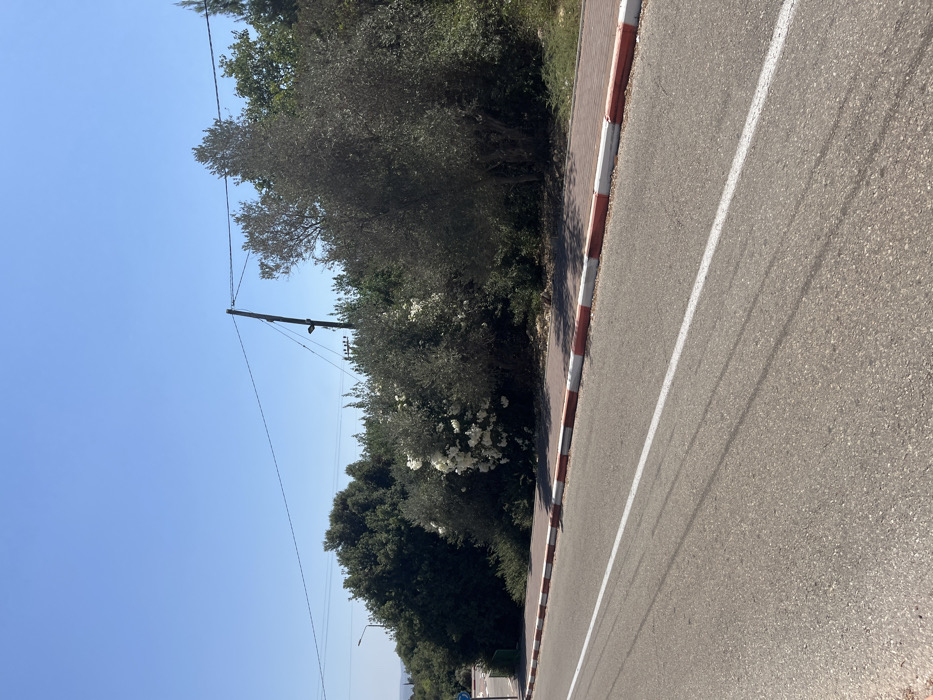 The image displays an outdoor scene in the Menashe Regional Council, Israel, under bright daylight. The foreground consists of an asphalt road with a single, solid white line running longitudinally down its visible length. Faint tire marks are present on the road surface. To the right of the road, a curb is visible, painted with alternating red and white stripes. Behind the curb, an unpaved earthen shoulder leads to a dense line of vegetation. This vegetation includes various green trees and bushes, with a prominent cluster of white-flowering plants situated in the central left portion of the foliage. Several mature trees with dense, dark green leaves, consistent with olive trees, are also visible. In the upper mid-ground, a dark utility pole supports multiple overhead power lines that extend horizontally across the frame. A street light fixture is mounted on the utility pole. The background features a clear, bright blue sky, with a distant, undefined landmass visible on the far left horizon. No individuals, animals, or dynamic actions are depicted.