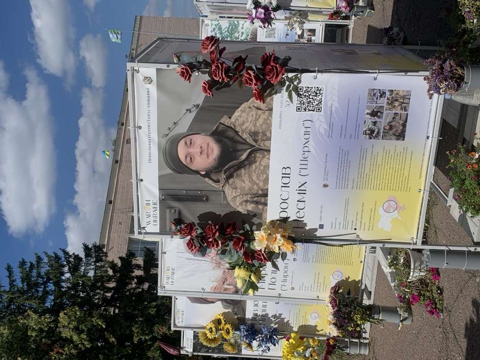 The image presents an outdoor memorial exhibition in Bohuslav, Ukraine, under a bright blue sky with scattered cumulus clouds