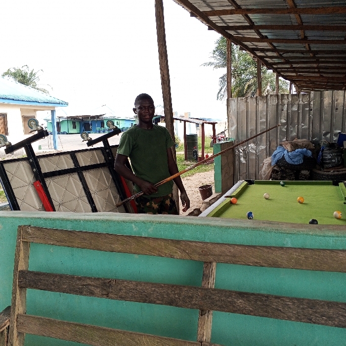 The image displays an outdoor, partially sheltered recreational setting in Koko, Nigeria