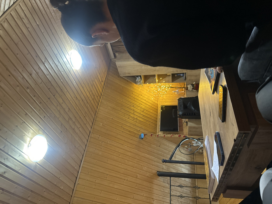 The image depicts an indoor scene within a room characterized by extensive light-colored wooden paneling on the walls and a sloped ceiling, typical of an attic or a converted upper floor. Two prominent circular ceiling lights provide bright illumination. The precise location within the city of Tbilisi, Georgia, is not discernible from the visual evidence. In the foreground, a large, rectangular wooden table is centrally positioned. On its surface, a dark-colored smartphone displaying an illuminated screen with colorful content is held by an individual. Another dark-colored smartphone and a white piece of paper beneath a book with an illustrated cover are also present on the table. Two individuals are partially visible, seated at the table. On the right, a person is seen from behind, wearing a black long-sleeved top and dark pants, with dark hair tied in a bun. They are facing away from the camera, towards the room's back wall. On the left, only the lower legs of a second individual, clad in light-colored pants, are visible, indicating another person seated opposite. The background features a wall-mounted flat-screen television above a large, black portable speaker. To the right of the television, a tall, decorative fixture resembling a bare tree with numerous small, warm-toned LED lights stands on the floor. Adjacent to this is a wooden shelving unit containing various decorative items, including figurines and a blue vase. A string of red decorative elements hangs vertically on the wall above the television. A section of a black metal bed frame with ornate details is visible on the far left.