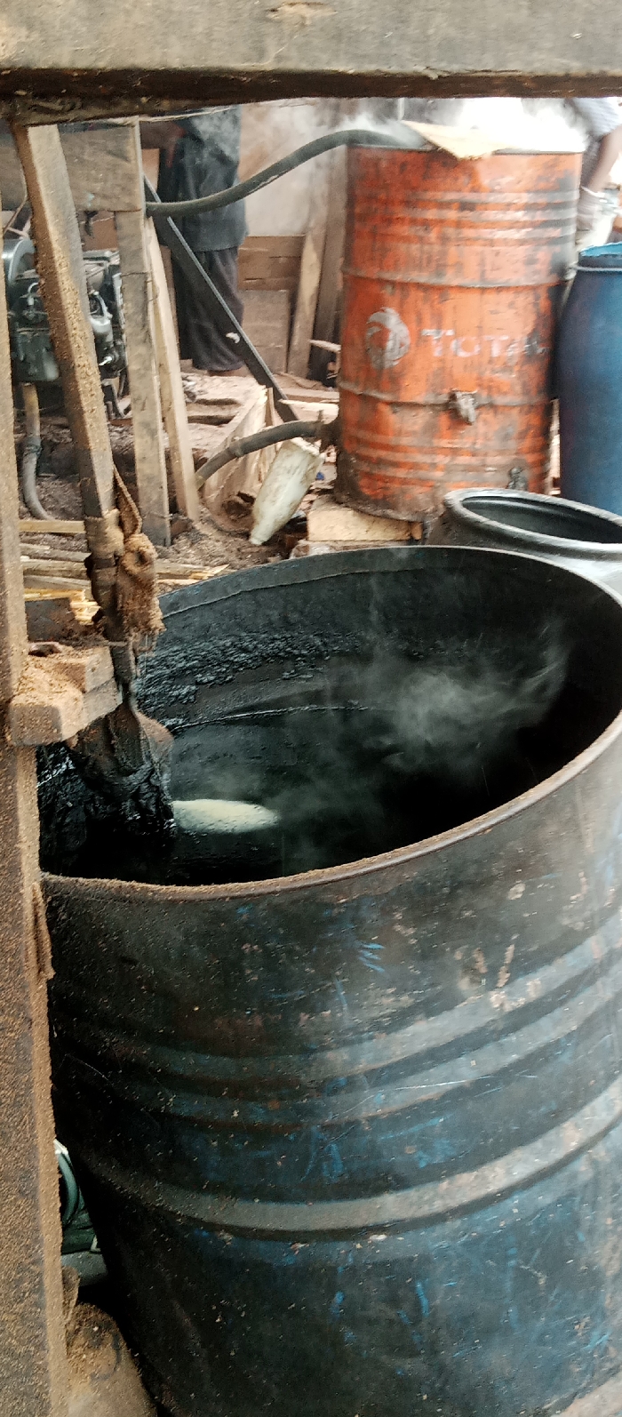 The scene depicts an industrial processing area in Fegge, Nigeria. In the foreground, a large, dark metal barrel, cut open horizontally, contains a black, viscous substance emitting visible steam. A metal pipe or rod, wrapped with fibrous material, extends into this open barrel from a wooden support structure on the left. Behind this, an orange metal drum, marked "TOTAL," stands upright, with a hose connected to its top, also showing signs of steam emission. A blue plastic drum is partially visible behind the orange one. Industrial machinery, resembling an engine, is partially visible behind the wooden structure on the left. The lower body of an individual, dressed in dark trousers, is visible in the background, positioned behind the orange drum. The ground is scattered with wooden planks, debris, and a white plastic bottle. The overall setup indicates an active heating or processing operation.