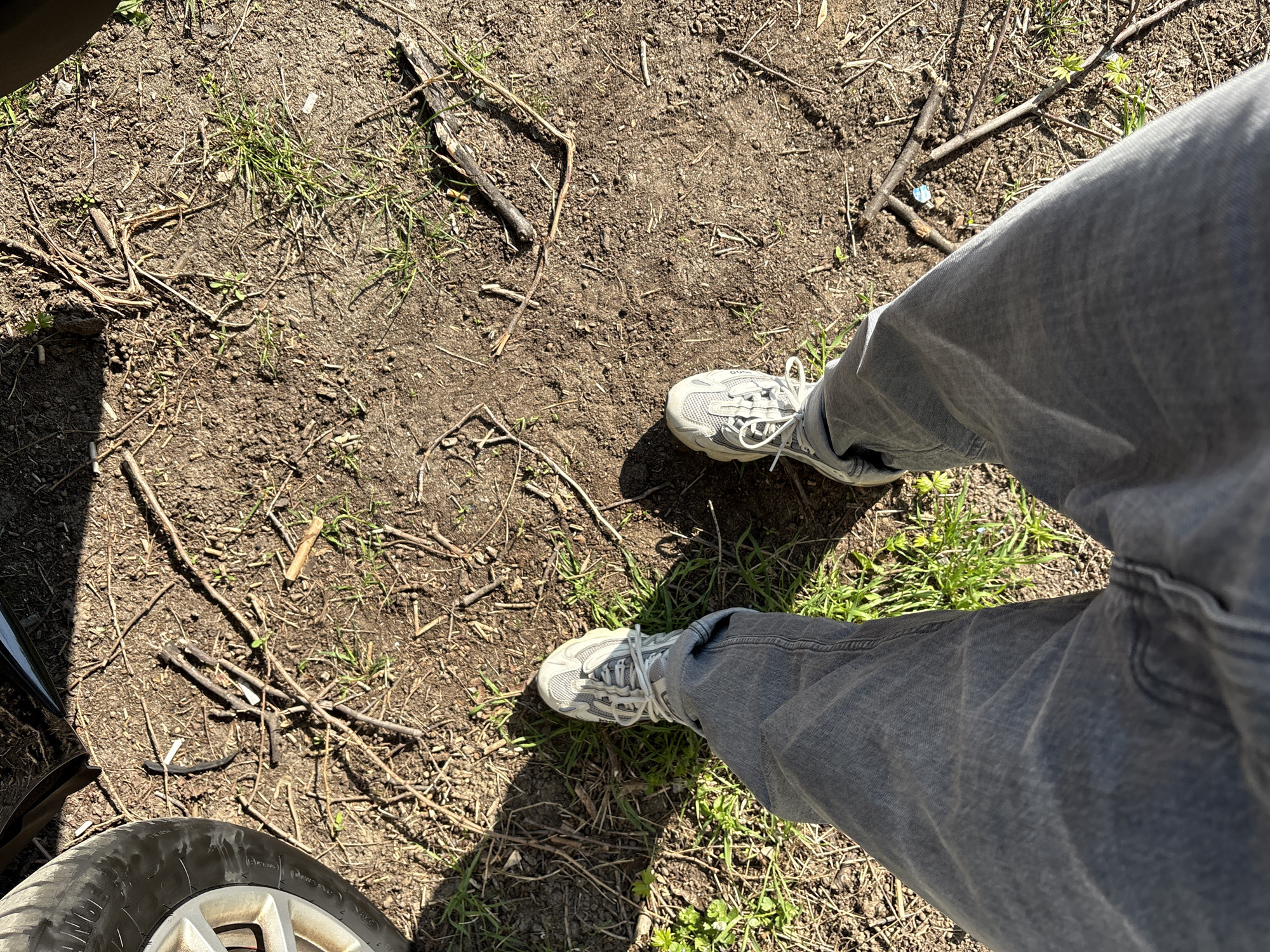 The image depicts a person standing on dirt and sparse grass, with some twigs and small branches scattered around. The person is wearing grey jeans and grey sneakers. A portion of a car tire is visible in the lower left corner of the image. The location is unknown; there is no information provided in the image to suggest it is in Vidin, Bulgaria.