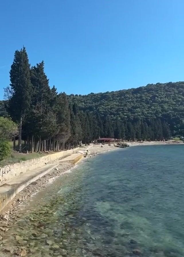 The video showcases a scenic view of a beach meeting the sea under a clear blue sky. The camera, initially focused on a rocky shoreline and a concrete path with graffiti, pans right to reveal a beach lined with tall, thin trees leading up to a heavily forested hill in the background. The water is clear, with visible rocks underneath near the shore, and becomes a deeper blue further out. A small bird is seen diving into the water, leaving a momentary disturbance on the surface. The sun glints off the sea, adding sparkle to the scene.