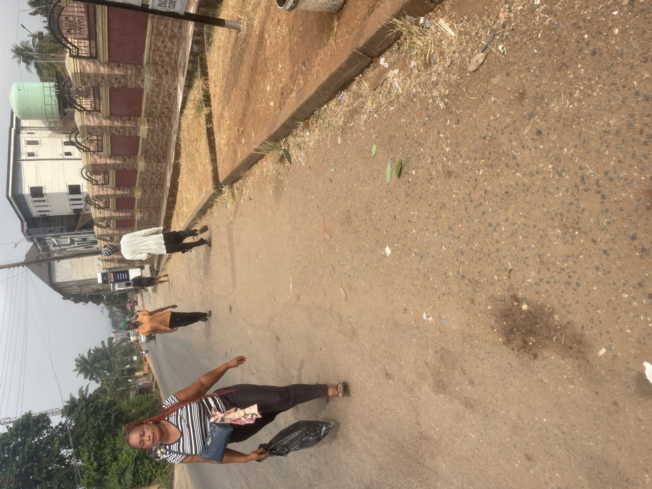 This image depicts a daytime street scene in Neni, Nigeria. The foreground shows a light-colored asphalt road with scattered debris and dirt stains. A woman with reddish-brown braided hair, wearing a striped short-sleeve top, black leggings, and brown sandals, is walking towards the viewer's left while holding a black plastic bag in her left hand. A blue purse with a multi-colored scarf attached hangs across her body. Her eyes appear closed or squinting. Further down the road, another individual wearing an orange shirt and dark trousers walks away from the camera on the paved surface. To their right, a third person in a white long-sleeve shirt, dark trousers, and a dark cap walks away from the camera on the road's edge. A fourth individual in dark clothing is visible further in the background. On the right side of the frame, a raised concrete curb separates the road from a dry, unpaved strip of ground with sparse, dried vegetation. Beyond this strip, another concrete curb precedes a decorative red-brown brick and darker-colored metal fence. Behind the fence, a multi-story, light-colored building with multiple windows and a green water tank on its roof is prominent. A darker building stands adjacent to it. Power lines and utility poles are visible above the buildings. The left side of the road is lined with tropical foliage, obscuring distant structures. The sky is overcast or hazy.