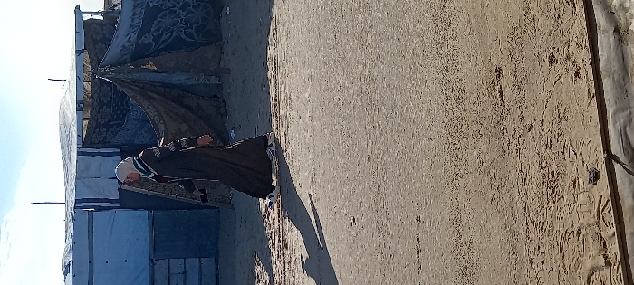 A woman wearing a hijab and dark robe stands next to a makeshift tent or structure. The structure appears to be constructed from corrugated metal sheets and fabric, possibly for shelter. The background is a dirt or sandy area, possibly a street or open space. The image is somewhat blurry and sideways. The overall impression is a scene of poverty or displacement, where improvised shelters are necessary.