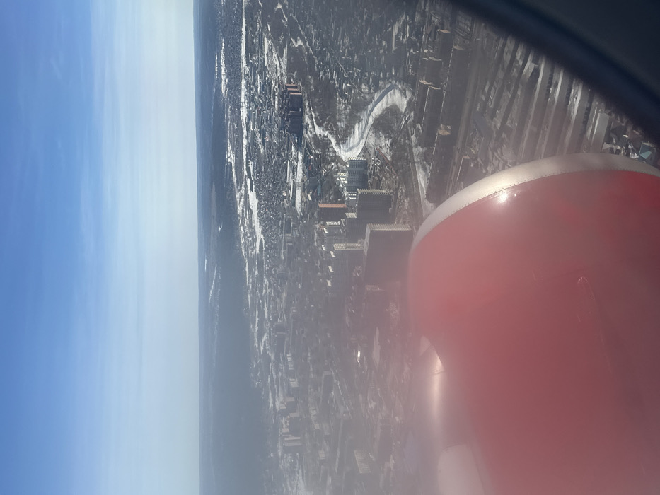 An aerial image, likely captured from an aircraft, depicts a winter urban landscape under a clear blue sky