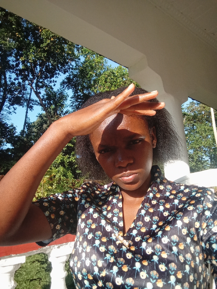 A dark-skinned woman shields her eyes from the sun with her left hand. Her expression is serious. She wears a dark, floral-patterned blouse. Behind her, lush green trees fill the background, with glimpses of blue sky. A white structure, possibly a veranda, is partially visible above and to the right. The lighting suggests it is a bright, sunny day. The photo appears to be taken outdoors.