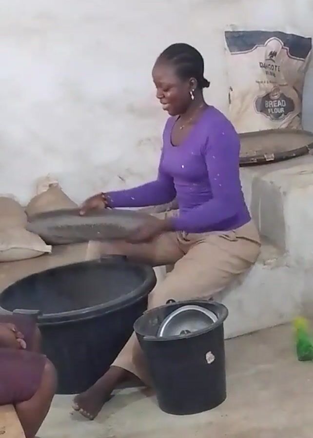 A woman wearing a purple long-sleeved shirt and khaki pants is sitting on a low concrete step indoors. She is barefoot and sifting something in a large, shallow metal pan. Underneath the pan is a large black bucket. Next to her is another black bucket with a lid. A woman wearing a dark shirt and purple pants is sitting next to her on a wooden stool. Bags of flour are stacked on the concrete step behind the woman doing the sifting. The setting appears to be a small, simple room.