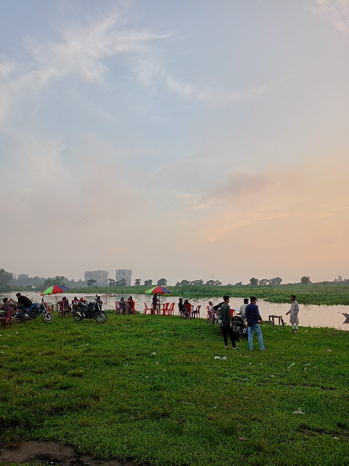 - "The image portrays an open green space adjacent to a substantial body of water within an urban peripheral zone of Dhaka, Bangladesh, characterized by distant high-rise development" by FM-ANLkq1, licensed under CC BY 4.0