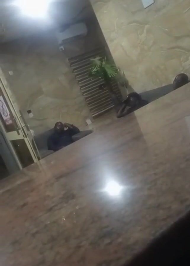 brightly lit hotel lobby. The floor and walls are covered in tan, patterned marble. A marble countertop runs across the bottom of the frame. Two people are seated on a couch behind the countertop. One person is on the phone and another is resting. A narrow, slatted partition and a potted plant stand in the background. Two documents hang on the wall above the couch. To the left of the couch is a glass door. A picture hangs on the wall to the right of the door.