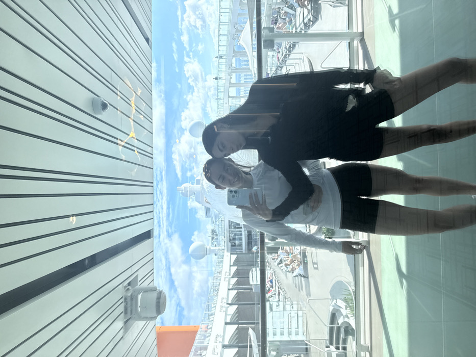 Two females are observed posing for a selfie in front of a large window aboard a cruise ship