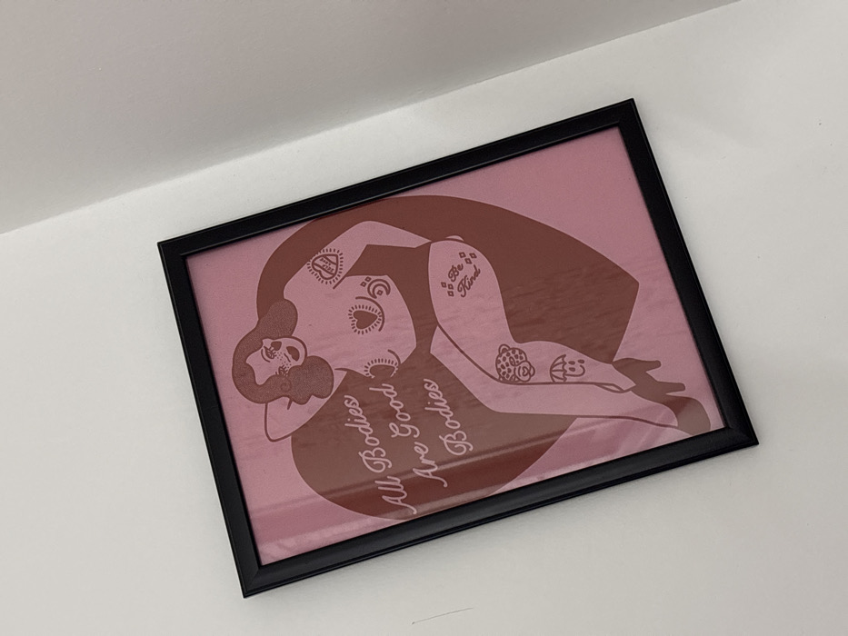 A black-framed picture is observed mounted against a plain white interior wall, positioned at an angle where the wall meets another white surface, forming an inward corner. The artwork within the frame features a stylized, light pink, curvilinear female figure with a full physique, set against a dark pink heart shape. The figure, depicted in a pin-up style with wavy hair and a smiling expression, is shown reclining or sitting with one arm behind her head. Numerous line-art tattoos are visible on her body: a heart with "You're Loved" on her left upper arm, a small heart and celestial symbols (crescent moon, stars) on her chest, "Be Kind" with diamond shapes on her right thigh, and a stylized bear head and a smiling umbrella on her left leg. The text "All Bodies Are Good Bodies" is inscribed in a cursive font over the dark pink heart, partially overlaying the figure's body. The immediate environment is stark white with uniform lighting. The scene is an interior setting, likely within a residence or business in Bat Yam, Israel. Specific geographic coordinates or a precise street address within Bat Yam are not ascertainable from the visual information provided.