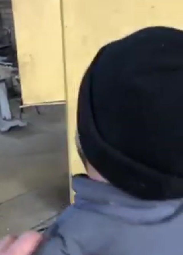 From a low-angle, rear perspective, a person wearing a black beanie and a grey jacket with the text "EGE BOYS" on the back is shown indoors. The person's back and head are in focus, while a hand is resting on their shoulder. The environment includes a light yellow wall and a cluttered workshop-like space in the background, with various tools and equipment partially visible. A round, gray container is also visible near the person. The camera appears to be stable during the shot.