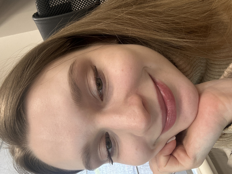 A young woman with fair skin and light brown hair poses with her face tilted towards the camera, resting her chin on her hand. She has green eyes, well-defined eyebrows, and glossy lips. The image is brightly lit, highlighting her clear complexion. The background is slightly blurred, showing a dark chair and a glimpse of a beige-colored garment.