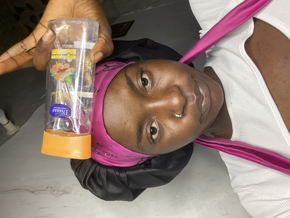 A person with a nose ring wears a pink head covering, a white top, and a black satin head covering. The person holds a clear plastic bottle with an orange cap labeled "Disaar Beauty Skincare" with an image of ginger and turmeric. The bottle contains a clear gel. The background is a white floor and a glimpse of a black object and a white plumbing fixture.